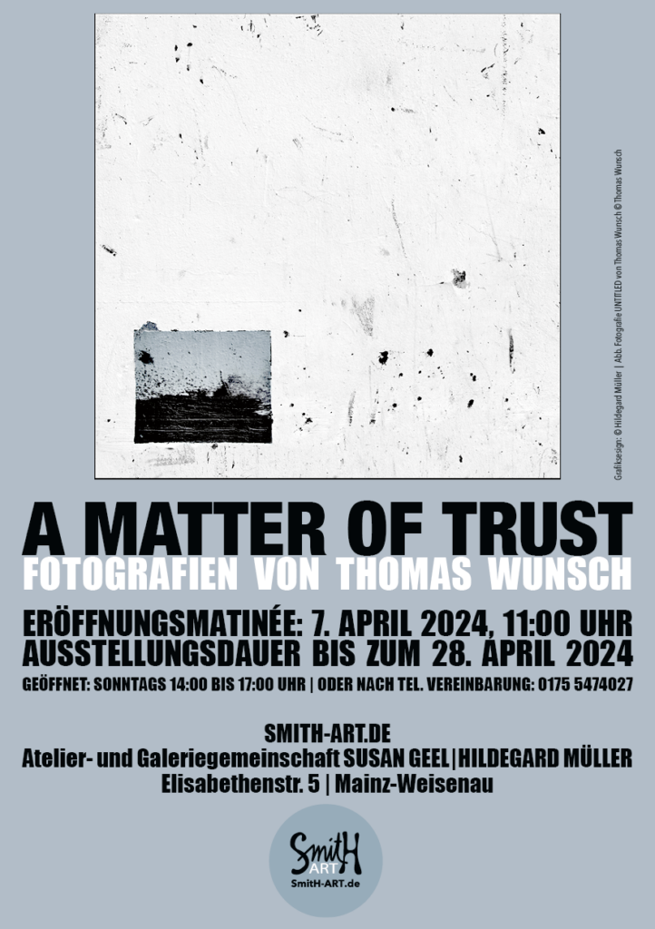 Herzliche Einladung zu einer Ausstellung der Galerie SmitH-ART: A MATTER OF TRUST – Fotograifen von Thomas Wunsch – Eröffnungsmatinée 7. April 2024 um 11 Uhr – Elisabethenstraße 5, 55130 Mainz-Weisenau – Ausstellungsdauer_ 7. bis 28. April 2024